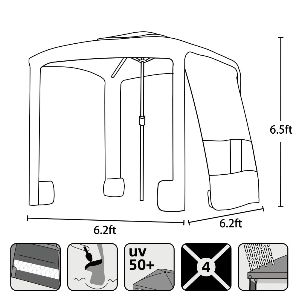 With Extra Removable Sidewall: Get full shade under the cabana with the detachable wall. 1.26/1.38" dia. pole with premium height adjustment, and the 6.2'x 6.2' canopy is crafted from premium UPF 50+ fabric, offering superior sun protection