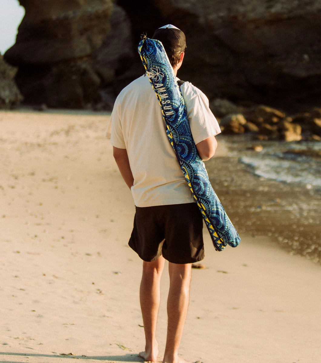 A man is carrying the bag on his shoulder for AMMSUN Revival Blues 7ft beach shade umbrella with sand anchor