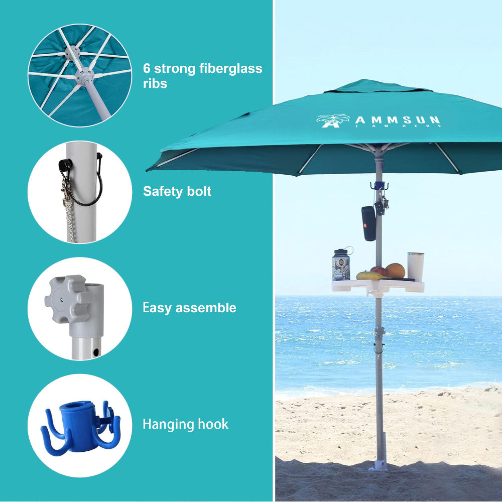 AMMSUN 8ft teal heavy duty beach umbrella with sand anchor with 6 strong fiberglass ribs has a safety bolt and hook