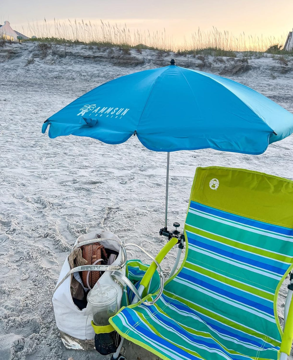 A beach chair and an AMMSUN 43 inches Chair umbrella with Universal Clamp, Bright Blue umbrella clip for chair
