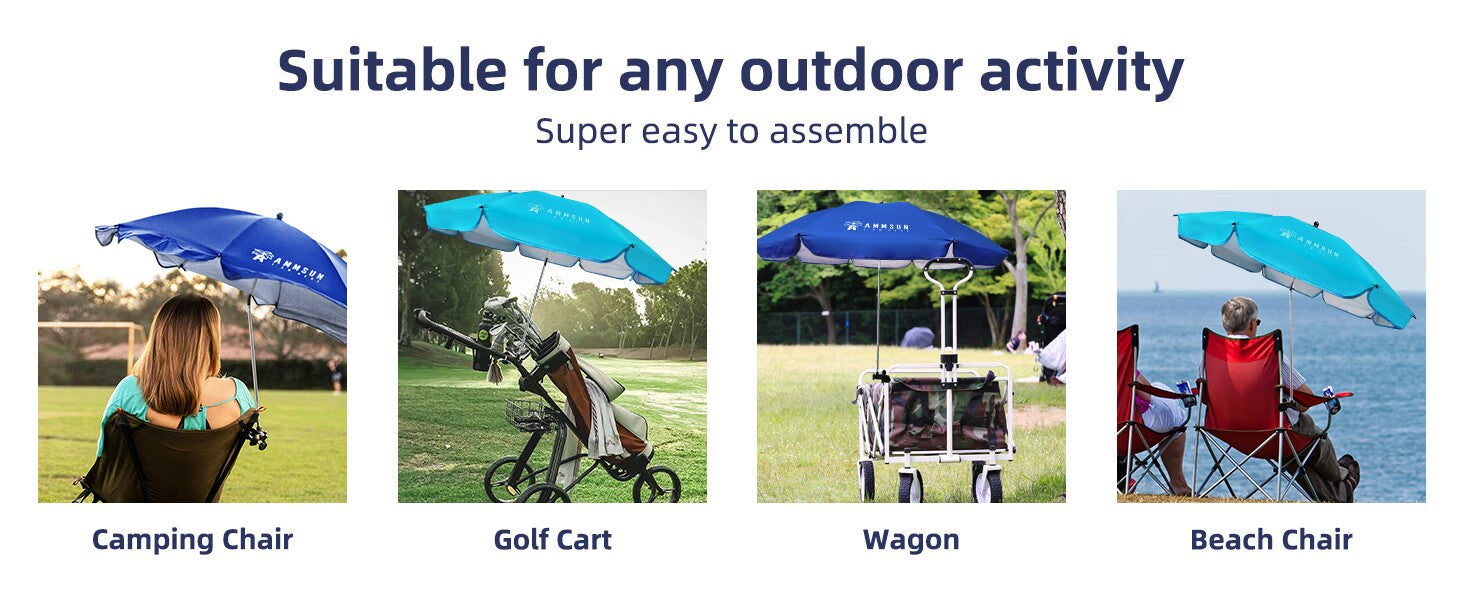 VERSATILE & WIDELY APPLICABLE: The AMMSUN chair umbrella is versatile and perfect for providing effective sun shade while keeping your hands free. It can be securely clamped onto round and square surfaces such as camping or beach chairs, strollers, wheelchairs, golf carts, and loungers.